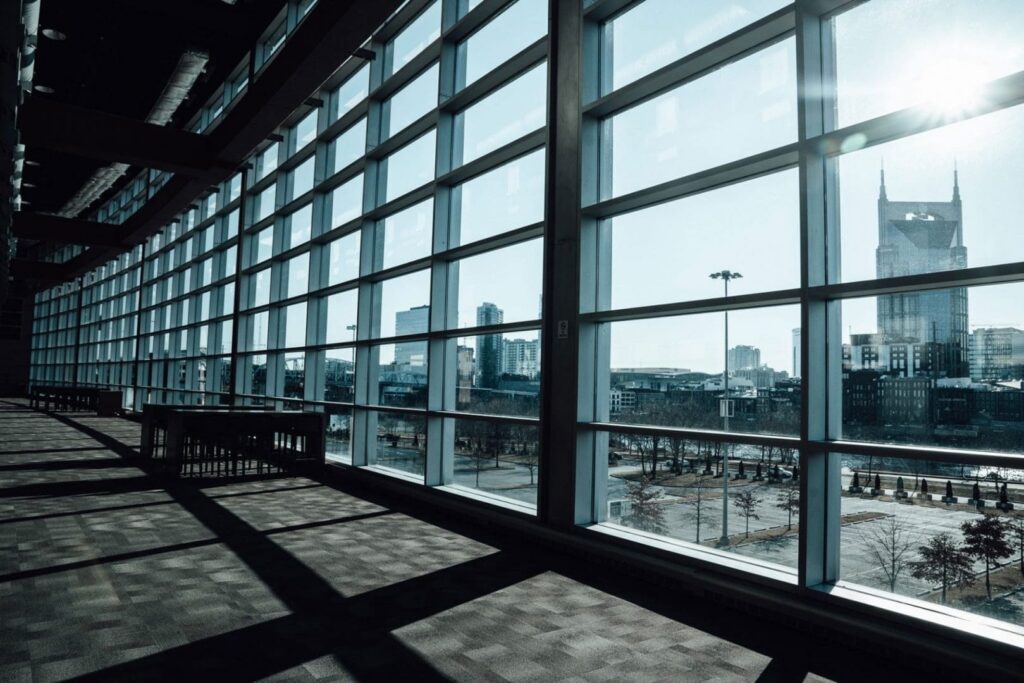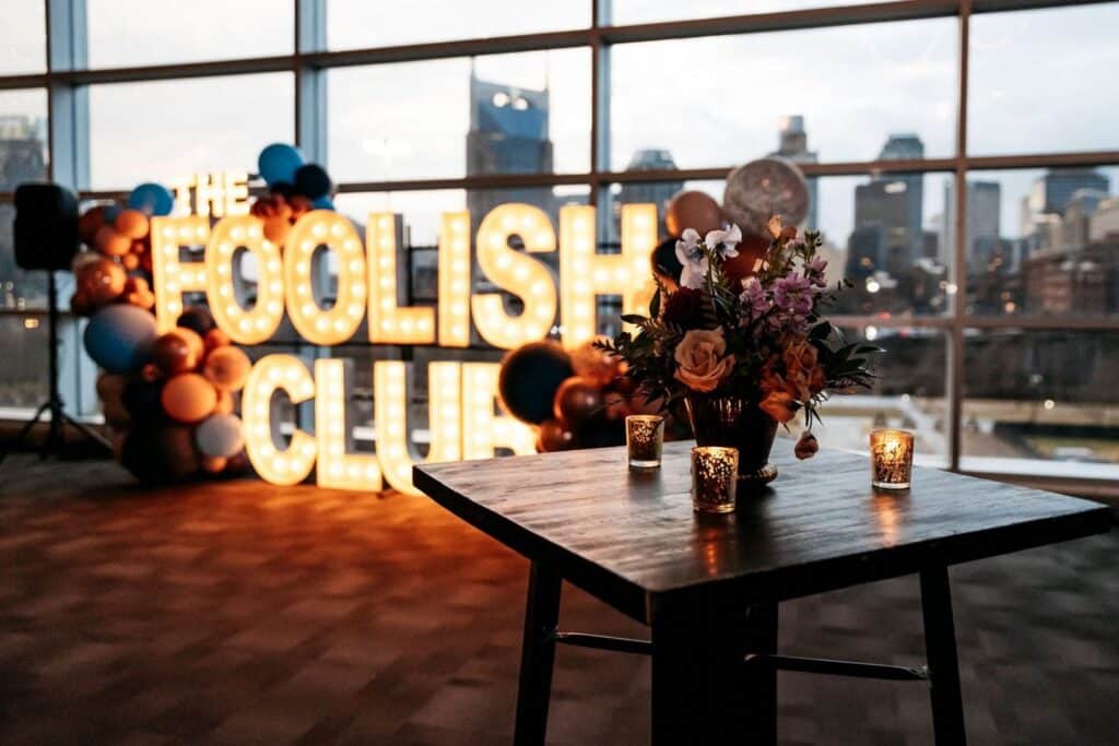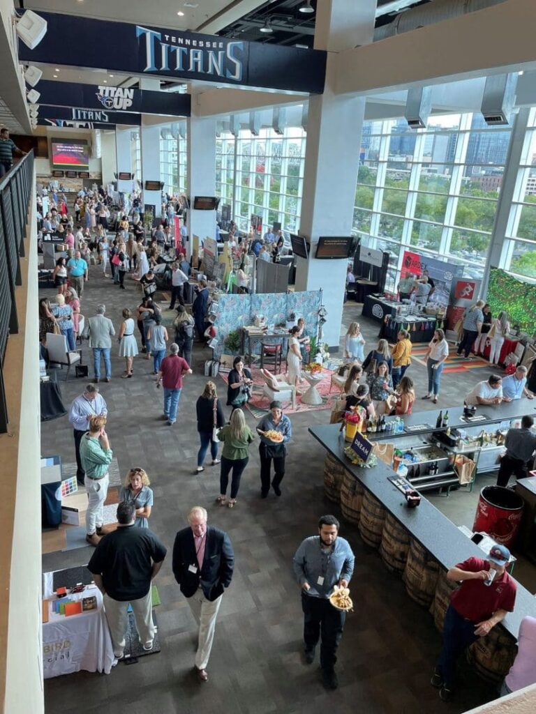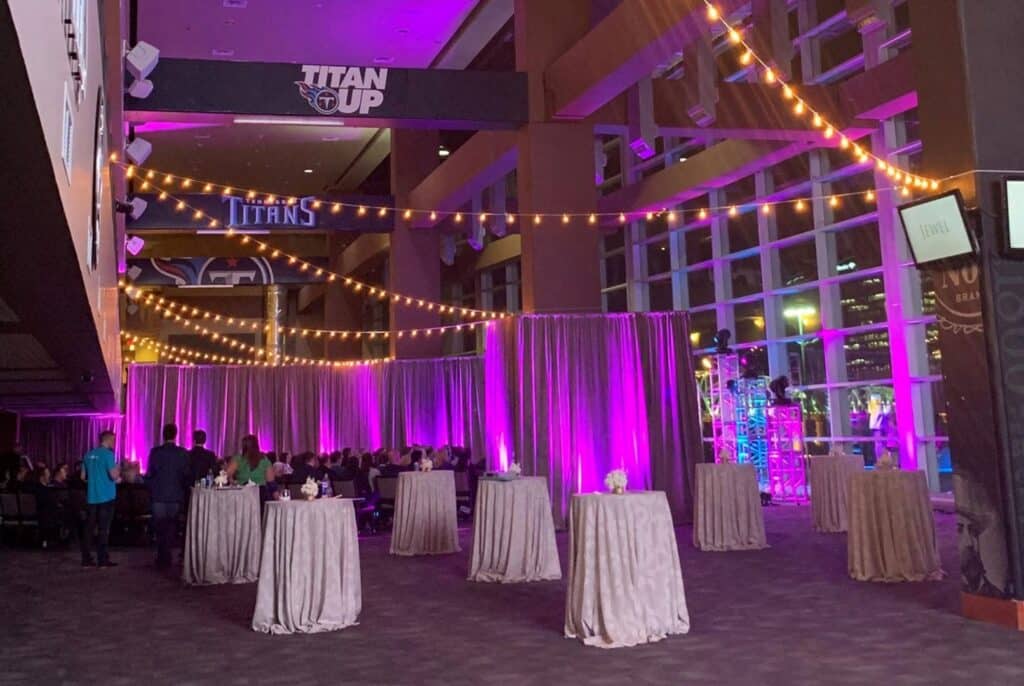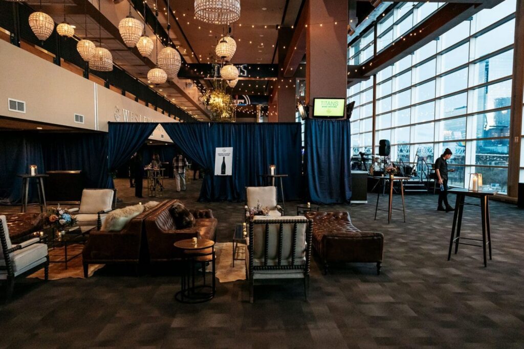Experience sweeping views of downtown Nashville from our premier West Club event space, featuring floor-to-ceiling windows, two bars, video walls, 22 TVs, lounge areas, stadium seating access, WiFi, and included event furniture with convenient on-site parking.