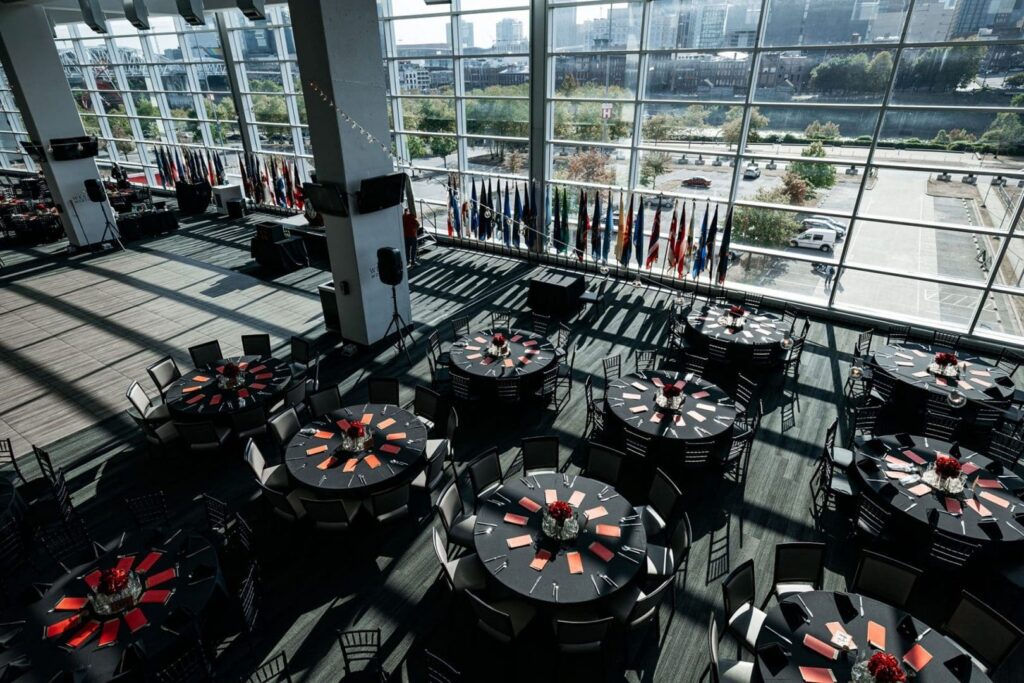 A premier event space with downtown views, two bars, videowalls, lounge areas, event furniture, and stadium‑seat access.